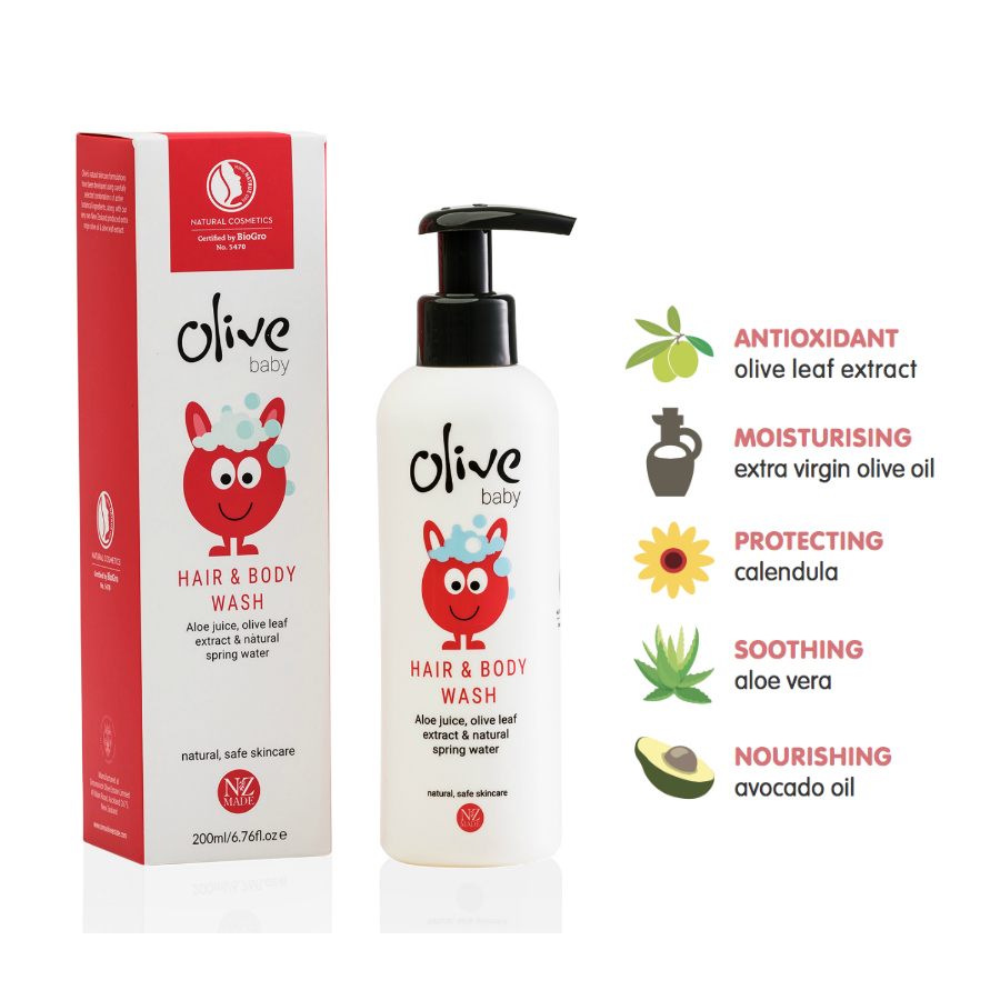 - Olive Baby Hair & Body Wash is a gentle formula to cleanse, moisturise and condition your infant’s skin and hair.